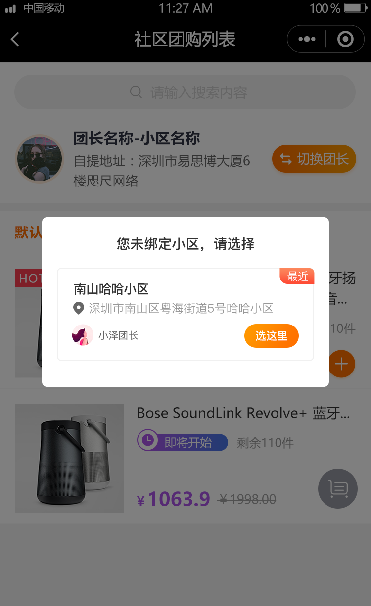新用户进入小程序,往往对其使用不熟悉。小程序自动推荐最近的团长,引导用户快速绑定,减少用户操作步骤。当用户分享链接,若当前绑定团长与分享团长不一致,自动提示用户上次绑定的团长,有效促进用户转化。