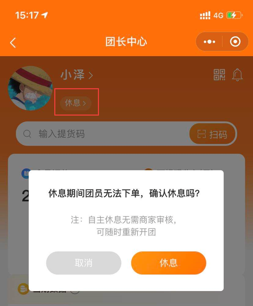 顾客不清楚何时开团,可能会不断下单,这样一来会增加团长工作量。现升级"休息“按钮,若不开团,团长可自主选择“休息”,顾客查看该团长时,将标记休息状态,无法下单。如需重新开团,可随时重新开启。从而避免订单混乱,减轻团长工作量。