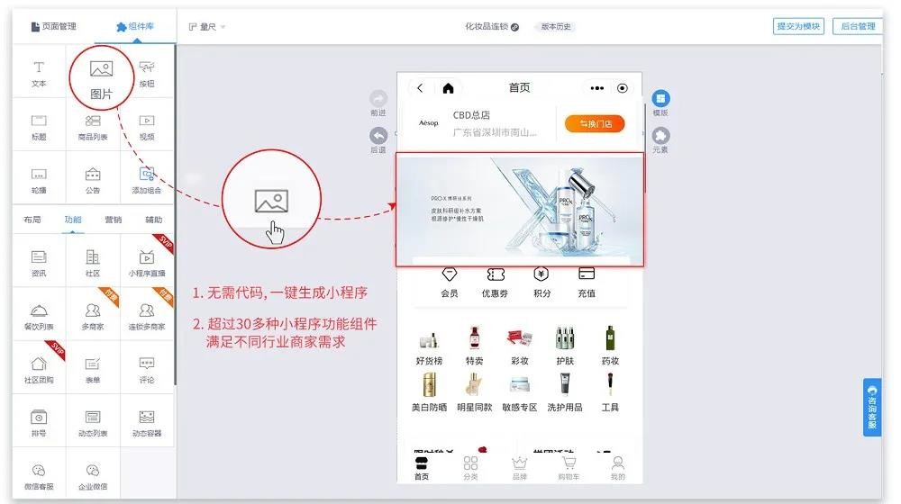 辣云应用支持可视化拖拽,无需代码立即生成小程序,拥有丰富的功能组件、齐全的行业模板以及强大的管理后台,满足小程序运营过程中多元化的场景需求。