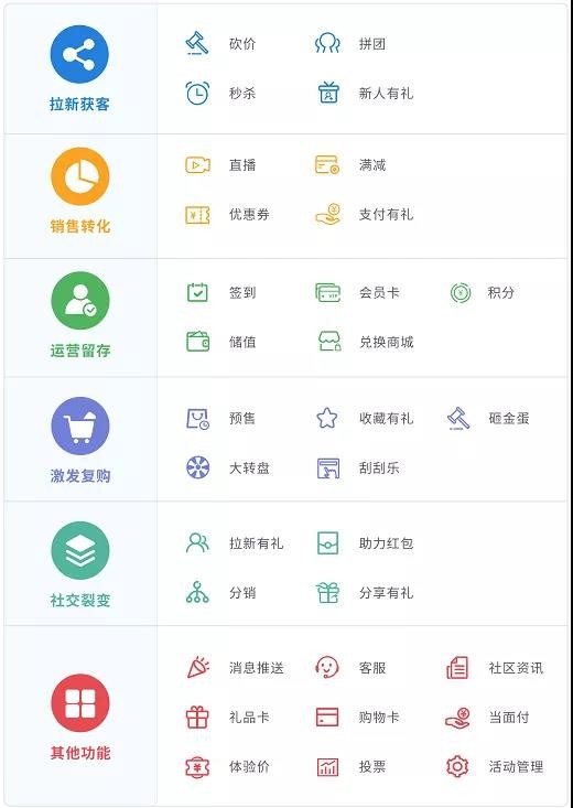 辣云应用从推广获客、用户留存、销售转化、激发复购、裂变拉新等多方面提供百余种的营销功能,包括拼团、直播、分销、裂变等,帮助商家快速促活客户,有效带动粉丝增长。
