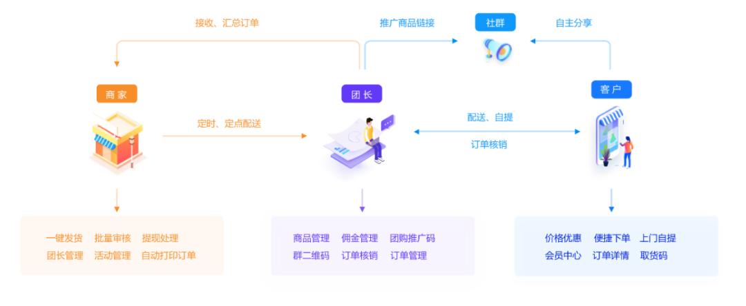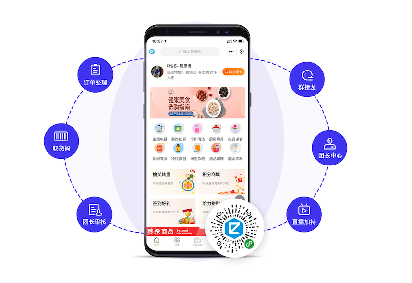 社区团购 , 以社区为切入点小程序为载体,通过社交方式销售产品的新型团购模式。商家招募团长,依托团长的社交关系搭建社群并推广产品获取佣金,帮助商家快速提高口碑与销量。