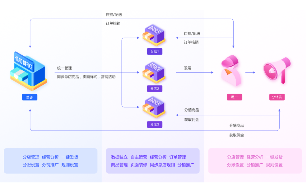 连锁小程序 , 总店统一管理分店,分店可自主运营,满足商家多样化需求。商家通过发展用户为分销员,让用户成为店铺的带货达人。