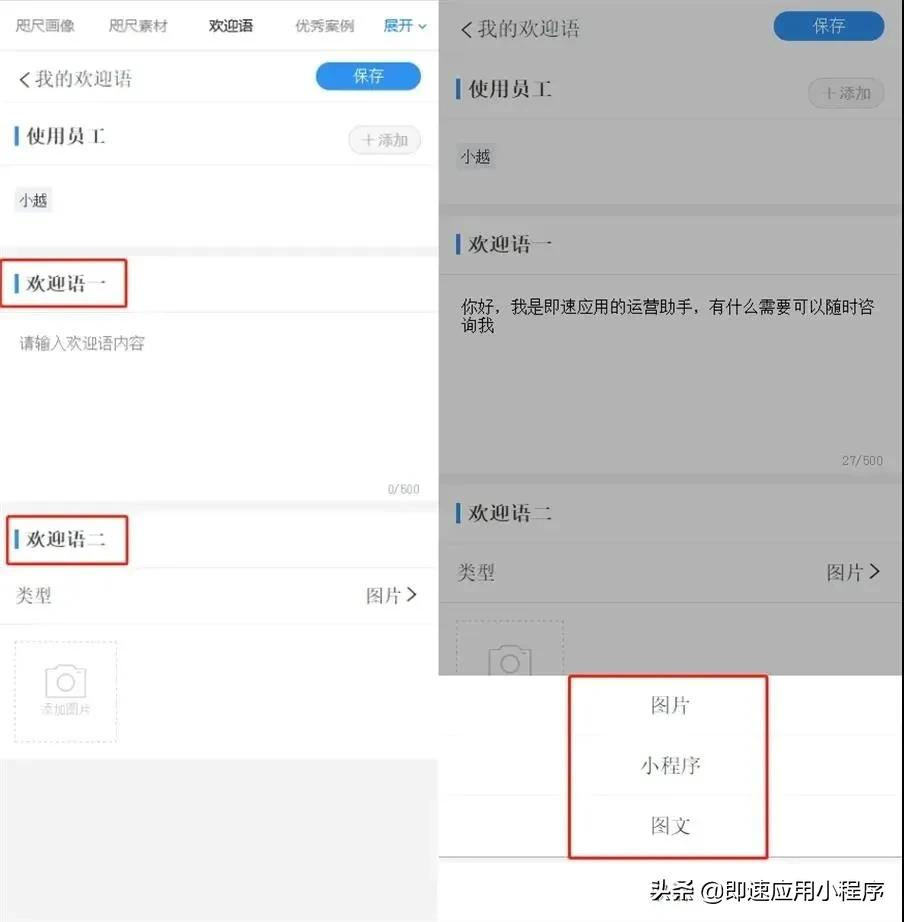 可以添加两条个人欢迎语,欢迎语一支持文字,欢迎语二支持小程序、图片、图文三种类型。