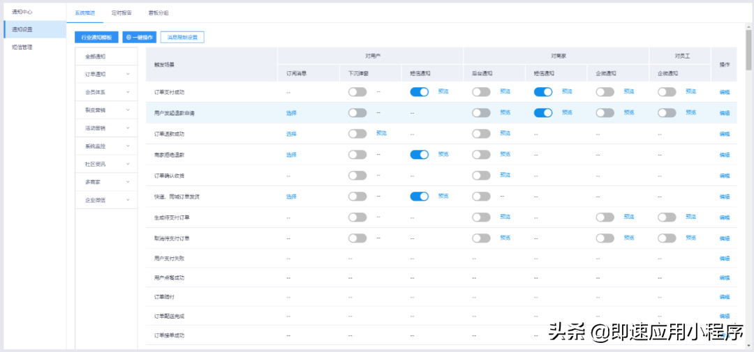 辣云消息推送是原本小程序消息通知的升级,原本的消息通知只能推送到小程序和短信,现在增加了企业微信这一种通知方式,不仅可以通知到商家,还能通知到每个员工。