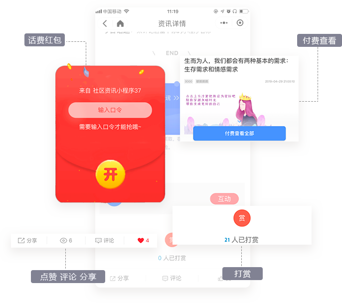 点赞、分享、评论、话费红包、打赏、付费阅读等多种互动方式,形成多向触达,唤醒用户,提高活跃度