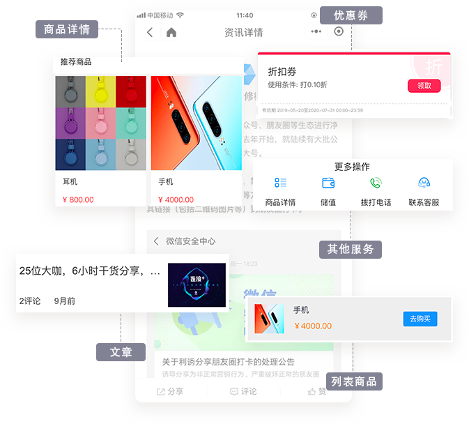 小程序内支持推荐话题、文章、商品、优惠券、活动等全套的服务,大幅缩短用户转化路径
