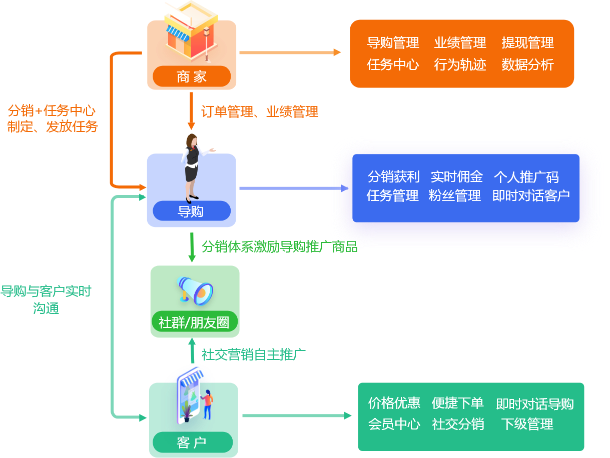 通过群聊,朋友圈、公众号、小程序等微信生态能力,不断触达客户,与目标客户产生联系,在联系的基础上进行互动与交易